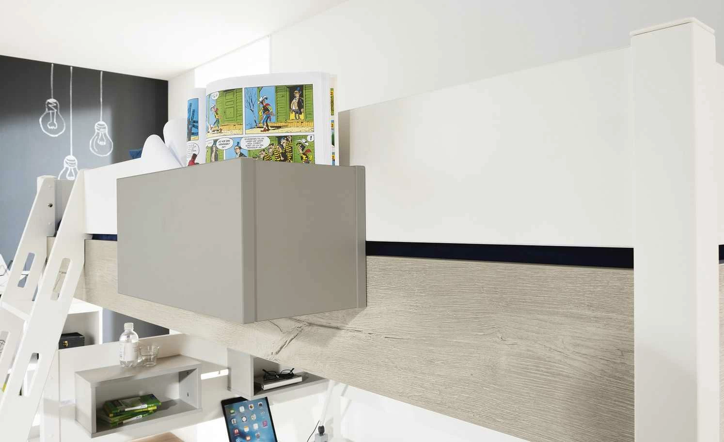 Diese Regalbox von PAIDI ist eine praktische Ergänzung für das Spielbett Kira. Sie wird einfach zwischen Bettgestell und Absturzsicherung platziert. Die Box kann mit der Öffnung nach vorne oder nach oben moniert werden – so wie es besser passt. Alle Oberflächen sind mit Melamin beschichtet und deshalb unempfindlich für Kratzer. Der kieselgraue Farbton harmoniert auch optisch mit dem Bett.